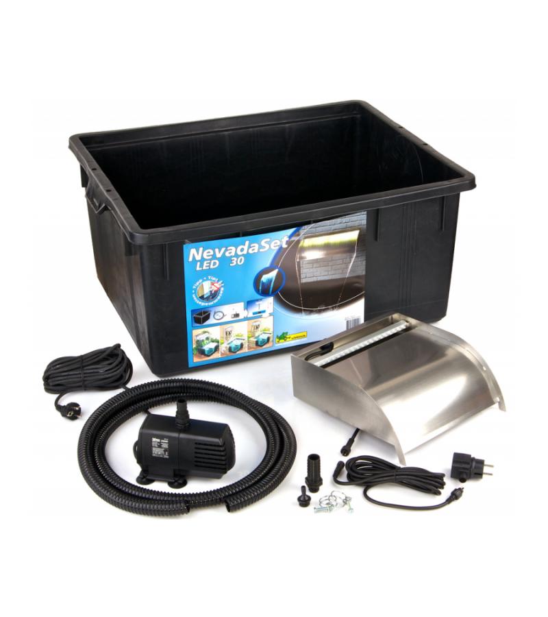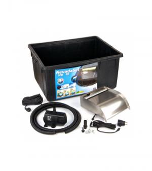 De Nevada waterval set is voorzien van alle benodigdheden om een prachtige waterval in uw tuin te kunnen aansluiten. De complete watervalset heeft een maximale montagehoogte van 75 cm en bestaat uit het watervalelement Nevada, 20 ledlampjes, een vijverpomp met een capaciteit van 2300 liter per uur, een 1.5 meter lange vijverslang en een container van 150 liter. U kunt de waterval bij de vijver plaatsen of los in de tuin zetten, waarbij u ook nog de mogelijkheid heeft om de waterval tegen een wand te plaatsen of in te bouwen. In combinatie met de vijverpomp zal er een brede waterfilm ontstaan, die mooi wordt verlicht en geruisloos terugvloeit in de vijver of het waterreservoir. De Nevada waterval biedt twee aansluitmogelijkheden, aan de achter en onderzijde met 1'' binnendraad en 25 mm slangaansluiting. De Nevada wordt geleverd inclusief schroeven en pluggen voor een makkelijke en juiste installatie.