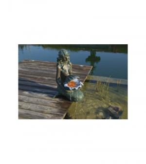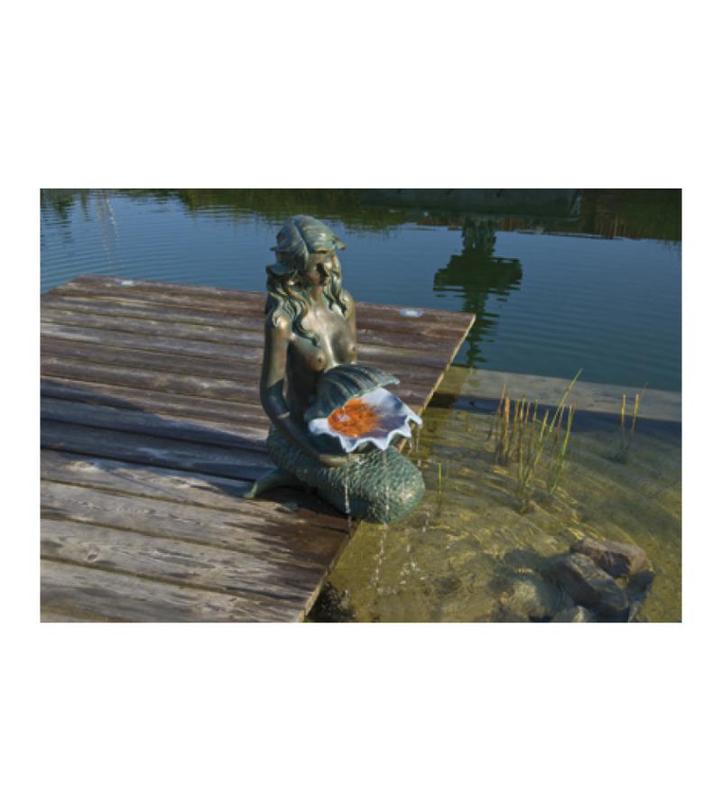 Het waterornament Oslo is een zeemeermin gemaakt van polyresin in een bronsachtige kleur. Het water loopt subtiel uit de schelp, die de zeemeermin vasthoudt, uw vijver weer in en zorgt voor een ontspannen geluid. Dit sfeervol ornament is een mooie aanvulling op uw vijver, maar kunt u eventueel, met opvangbassin (wordt niet meegeleverd), ook los plaatsen in uw tuin. De Oslo wordt geleverd met een bijpassende pomp, ledverlichting en aansluitmateriaal waardoor hij zeer eenvoudig is te monteren en te plaatsen. De verlichting wordt geleverd met drie verschillende kleuren kappen (rood, geel, blauw) zodat u speels de kleur van het water kunt veranderen voor nog mooiere effecten.