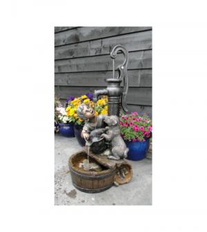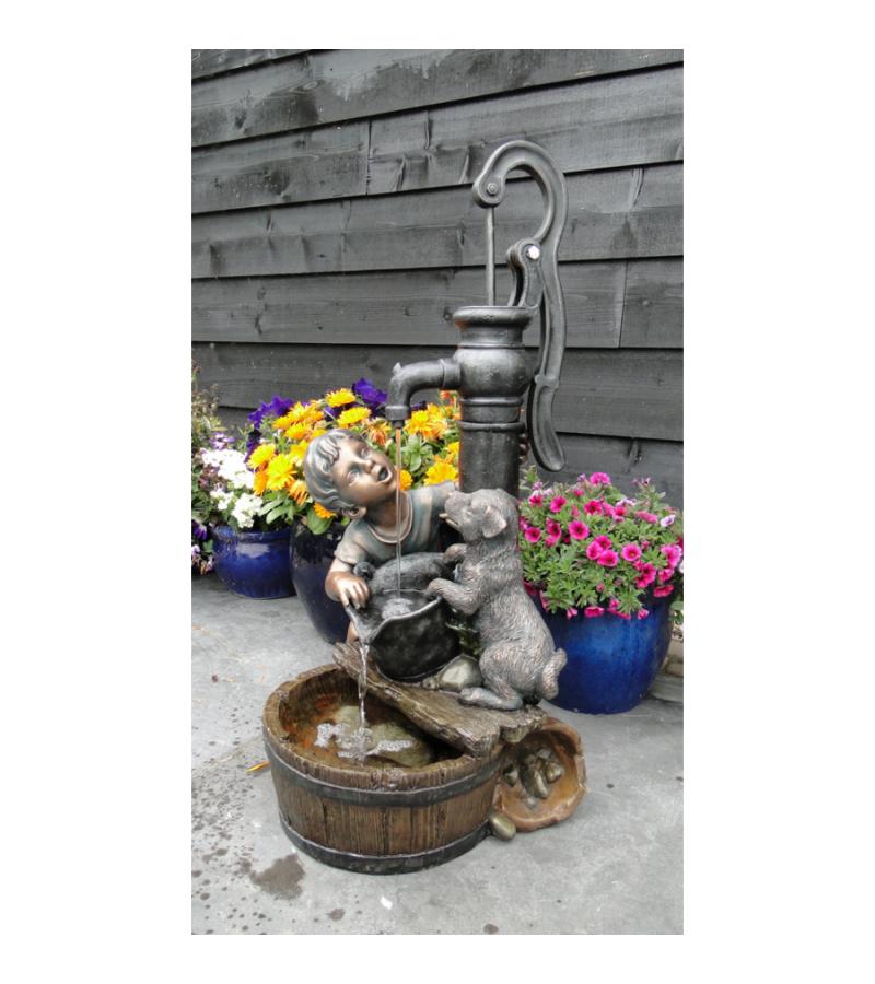 Hoe schattig is dit waterornament ''jongen en de hond bij de pomp''! De jongen en de hond drinken als het ware samen van het water dat uit de zwengelpomp komt. Dit decoratief waterornament is voorzien van de meest prachtige details en zal uw tuin of terras meteen opvrolijken!