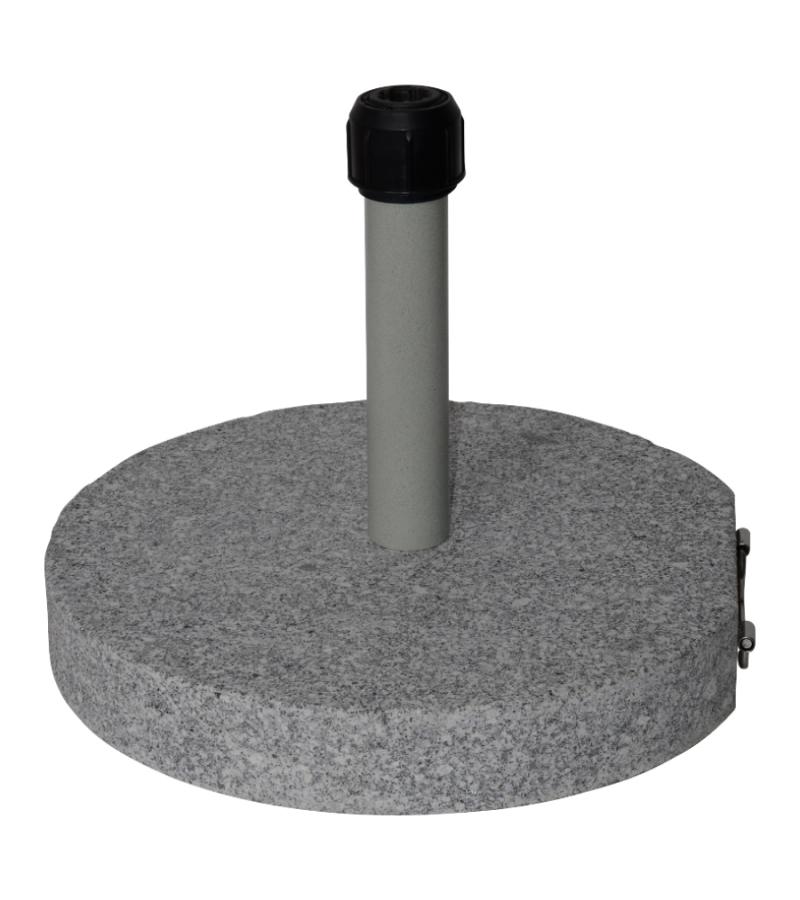 De parasolvoet graniet rond grijs 40 kg is een stevige parasolvoet gemaakt van graniet. De parasolvoet houdt uw parasol stevig en stabiel zodat de parasol niet omwaait. De voet is geschikt voor parasols met een stokdiameter tussen de 28 en 48 millimeter, middels de draaiknop kunt u de parasolstok stevig vastzetten.