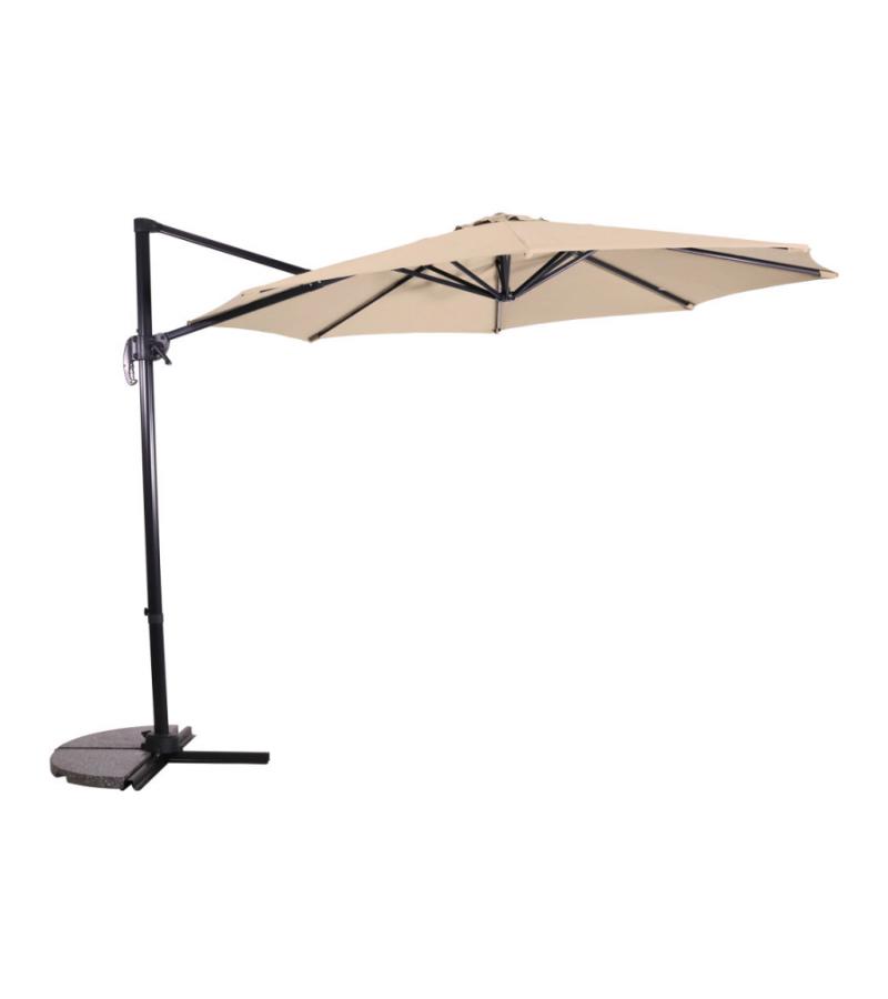 De zweefparasol heeft een diameter van drie meter waardoor hij voor een groot schaduwoppervlak zorgt. Het grote doek creëert genoeg schaduw voor de hele lounge- of dining set, zo kunt u met uw hele gezelschap genieten van een verkoelend plaatsje. De parasol is gemakkelijk te openen en te sluiten middels de molen, wanneer de zon te warm wordt heeft u de parasol binnen een handomdraai opengeklapt. Door de 360 graden draaibare voet kunt u altijd op iedere gewenste plaats schaduw creëren, zo bent u altijd verzekerd van een verkoelende plaats.