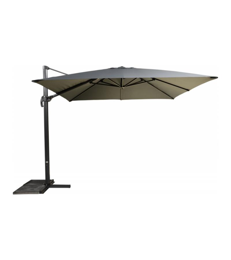 De zweefparasol dient geplaatst te worden op een passende parasolvoet, deze wordt niet meegeleverd. Een kruisvoet in combinatie met het aluminium frame en de acht aluminium baleinen van de parasol maakt het geheel zeer stabiel en robuust. De voetflens van de parasol is 360 graden draaibaar zodat u op ieder gewenste plaats schaduw kunt creëren.