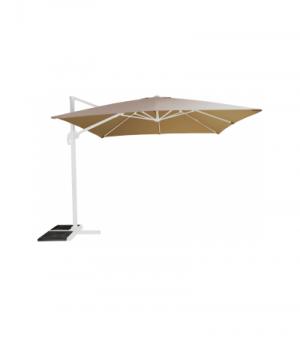 De parasol heeft een unieke uitstraling door het witte, aluminium frame en het zandkleurig doek. Deze kleurencombinatie maakt de parasol een aanwinst voor iedere tuin en gemakkelijk te combineren met ander tuinmeubilair. De kruisvoet wordt met de zweefparasol meegeleverd, deze kruisvoet dient verzwaard te worden met twee of vier tegels zodat de parasol stevig en stabiel blijft staan.