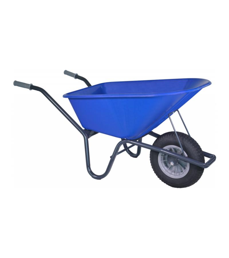 Een mooie lichte kruiwagen in een opvallende blauwe kleur. De bak van de kruiwagen is gemaakt van polypropyleen en is blauw van kleur, door het gebruik van het materiaal polypropyleen is het mogelijk dat de kruiwagen zo licht is. Het frame is gemaakt van metaal en premium gecoat met een grijze kleur en is gemaakt van ronde buizen.