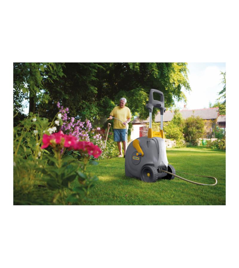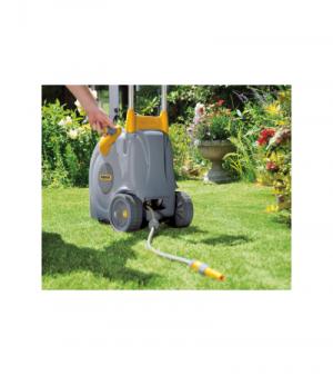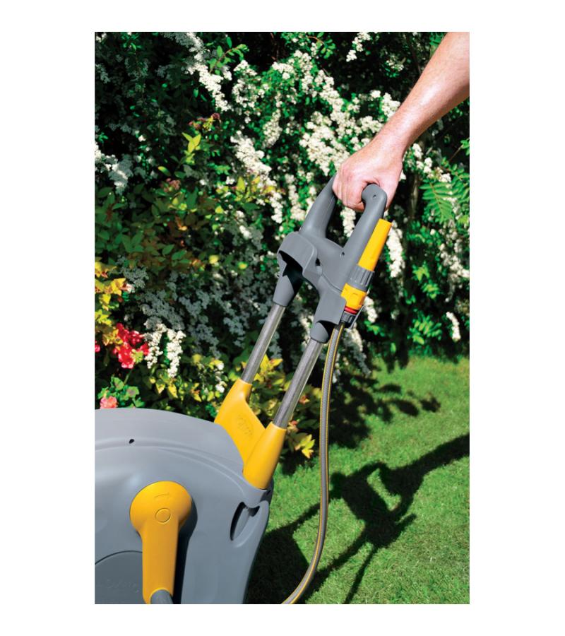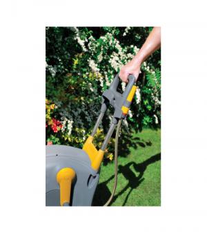 Deze tuinslanghaspel met het easy rewind systeem is mobiel door uw tuin te bewegen. U rijdt het karretje vanuit uw garage of schuur eenvoudig naar de watertoevoer. De gesloten box voorkomt beschadiging aan uw slang en een clip aan de brede handgreep maakt dat u uw tuinspuit drupvrij kunt opbergen. Met een slang lengte van 40 meter heeft u een ruim bereik en maakt dat deze slanghaspel geschikt is voor middelgrote tot grote tuinen.