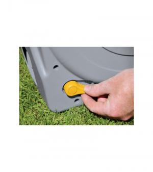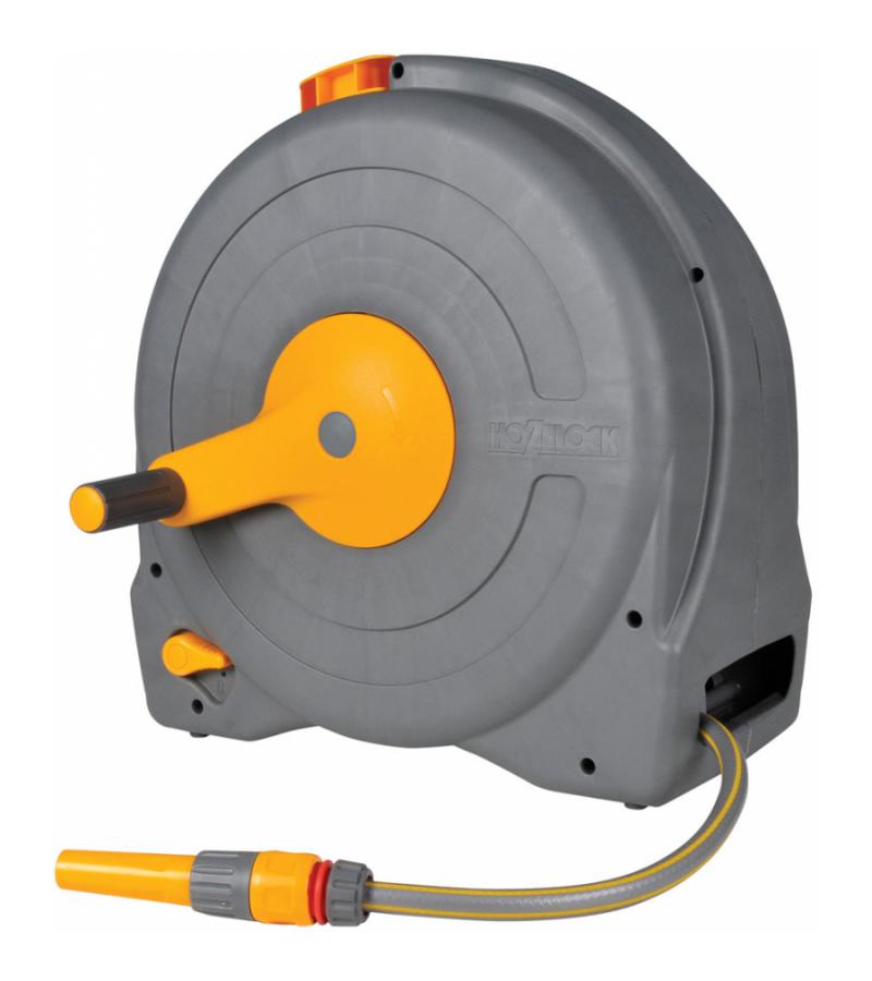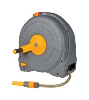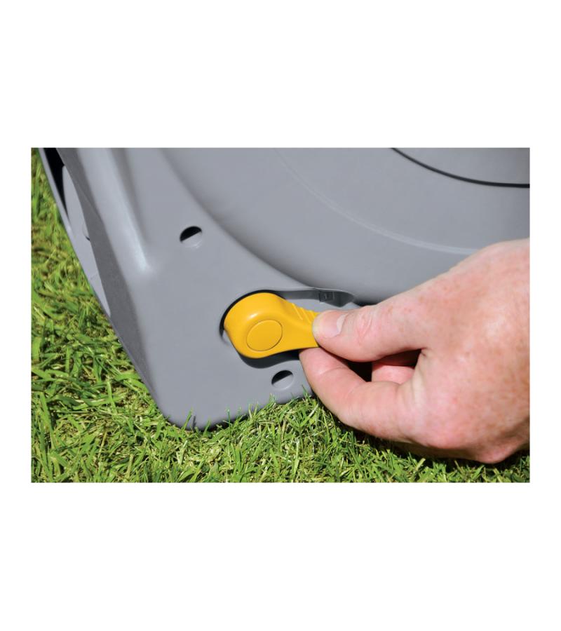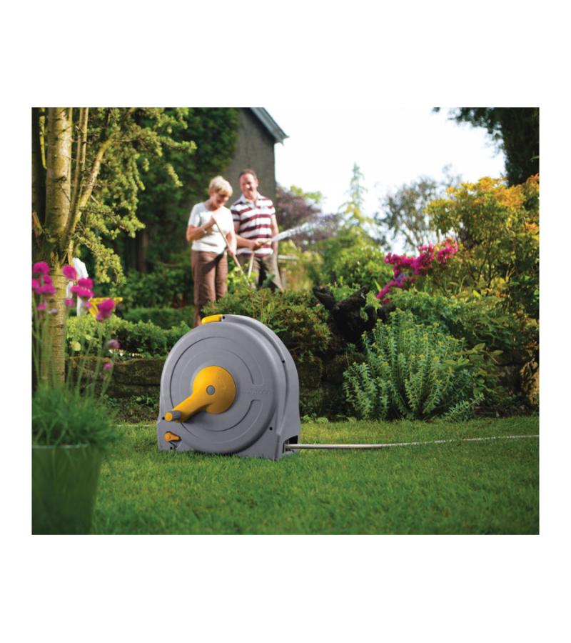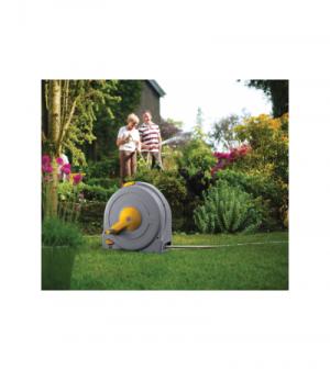 Deze gesloten tuinslanghaspel is voorzien van een zogenoemd easy rewind oprolmechanisme. Dit systeem zorgt ervoor dat het oprollen van de slang soepel en zonder moeite verloopt. De gesloten box zorgt ervoor dat uw tuinslang veilig opgeborgen staat. De vrijstaande tuinslanghaspel is makkelijk verplaatsbaar middels het handvat en is uitgerust met een toevoerslang van 2m en 40m verdeelslang. Na montage kunt u snel aan de gang; alle benodigde koppelstukken zijn inbegrepen en ook een waterspuit is inclusief.