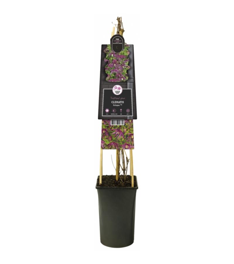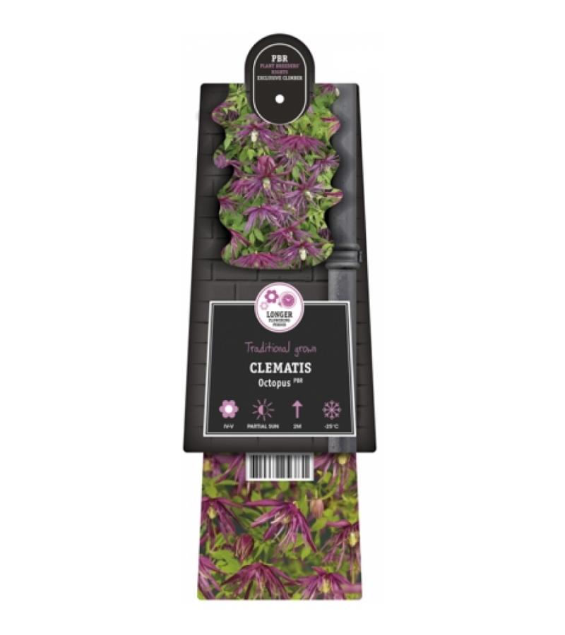 Waar deze paarse bosrank zijn oorspronkelijke naam 'Octopus' vandaan heeft is duidelijk wanneer u deze bijzondere bloem ziet. Het paarse fijne, smalle blad doet denken aan de tentakels van een octopus. Deze bosrank is een vroege bloeier en groeit minder hard dan soortgenoten. De volwassen hoogte zal ongeveer 2 meter zijn. Deze sierlijke bosrank is prachtig te combineren met andere bosranken in wit/roze tinten die een latere bloei kennen. Zo bent u verzekerd van een lange periode bloemenpracht in uw tuin.