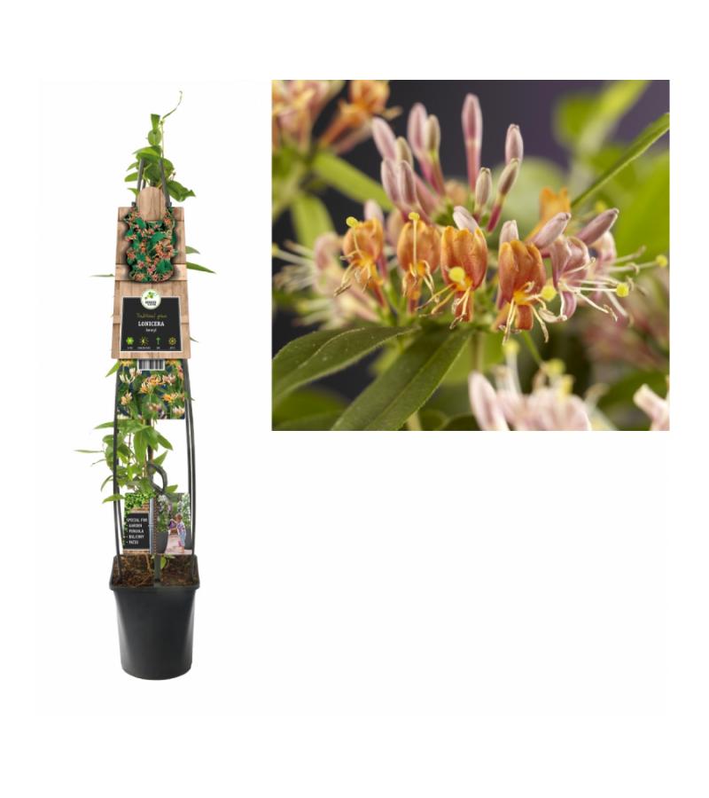 De kleine bloemen van deze roze kamperfoelie zijn al prachtig om te zien. Maar deze kamperfoelie heeft nog een andere troef; in zachte winters behoudt deze kamperfoelie zijn groene blad. Welke kleur hebben de bloemen nou precies? Geel, wit, roze, rood, paars? Alle tinten zitten er in, de ene keer zal de bloem vooral richting roze gaan, de andere keer heeft de bloem meer rode accenten. Met enige klimondersteuning kan de plant zich al slingerend tot een hoogte van 10m opwerken! Geniet op zwoele zomeravonden van de heerlijke geur die de kamperfoelie zal verspreiden!