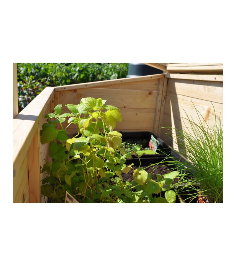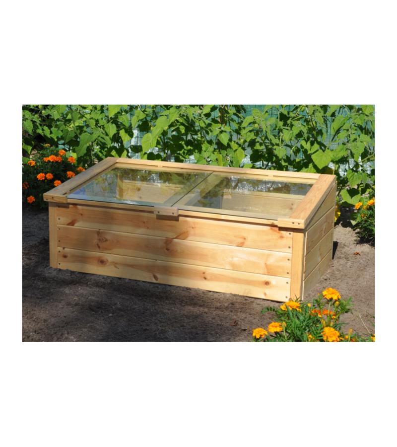 Deze kweekkas bestaat uit een houten frame en heeft een glazen afdichting. Het vurenhout heeft een dikte van 18 mm en is op ecologische wijze verduurzaamd met lijnzaadolie. Op die manier is het geschikt om jarenlang mee te gaan. De ruiten in de ‘klep’ aan de bovenzijde van de kweekkas zijn van 3 mm dik veiligheidsglas.