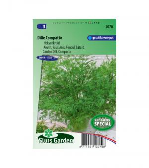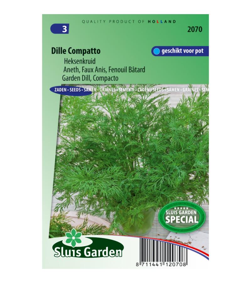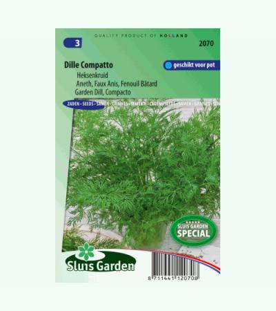 Dille is familie van de schermbloemige en heeft geveerde en breekbare bladeren. Dille is een makkelijk kruid om in de moestuin te kweken. Het kruid staat het liefst op een beschutte, zonnige plaats en heeft niet veel voeding nodig. Zaai de dille Compatto onder glas of buiten op een zaaibed. Zet de zaailingen zo spoedig mogelijk over in potten.