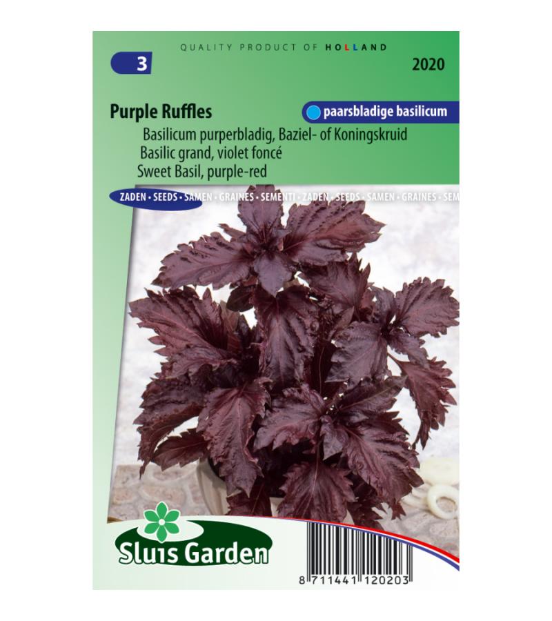 De Purple Ruffles heeft geen groene basilicumbladeren, maar prachtig intense paarse bladeren. De plant is een prachtige toevoeging aan uw kruidentuin! De bladeren hebben een zeer aromatische geur, zijn lekker van smaak en zien er mooi uit. Kortom: een erg smaakvol en kleurrijk keukenkruid, die erg lekker smaakt bij rijstgerechten!
