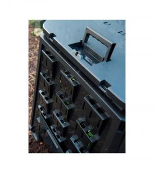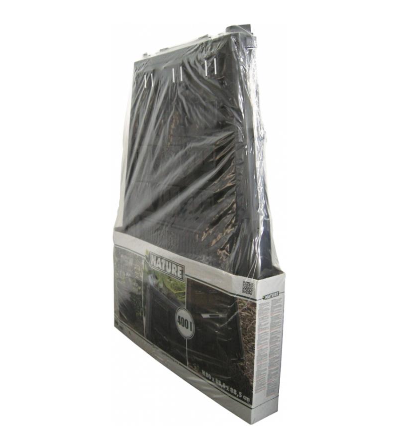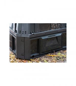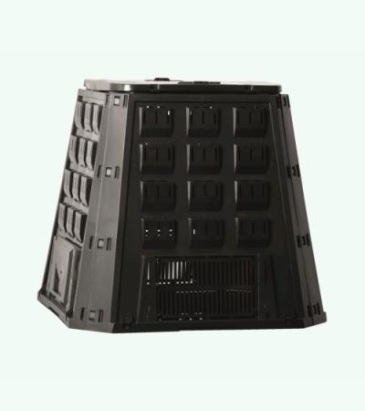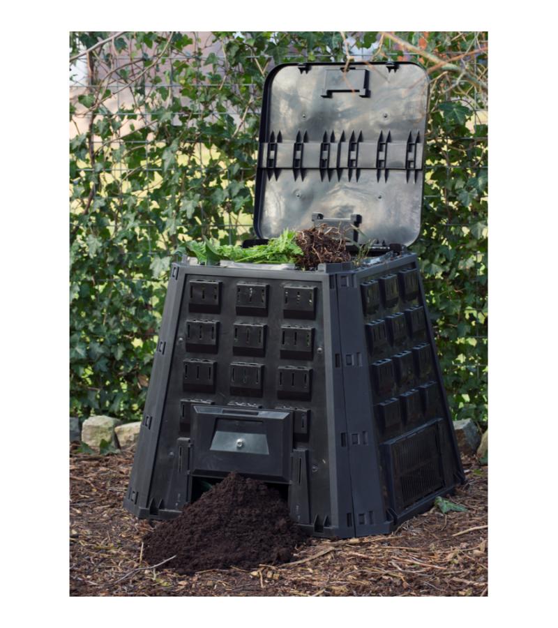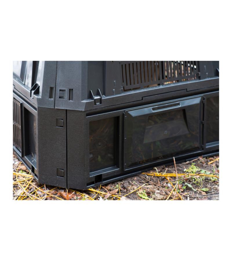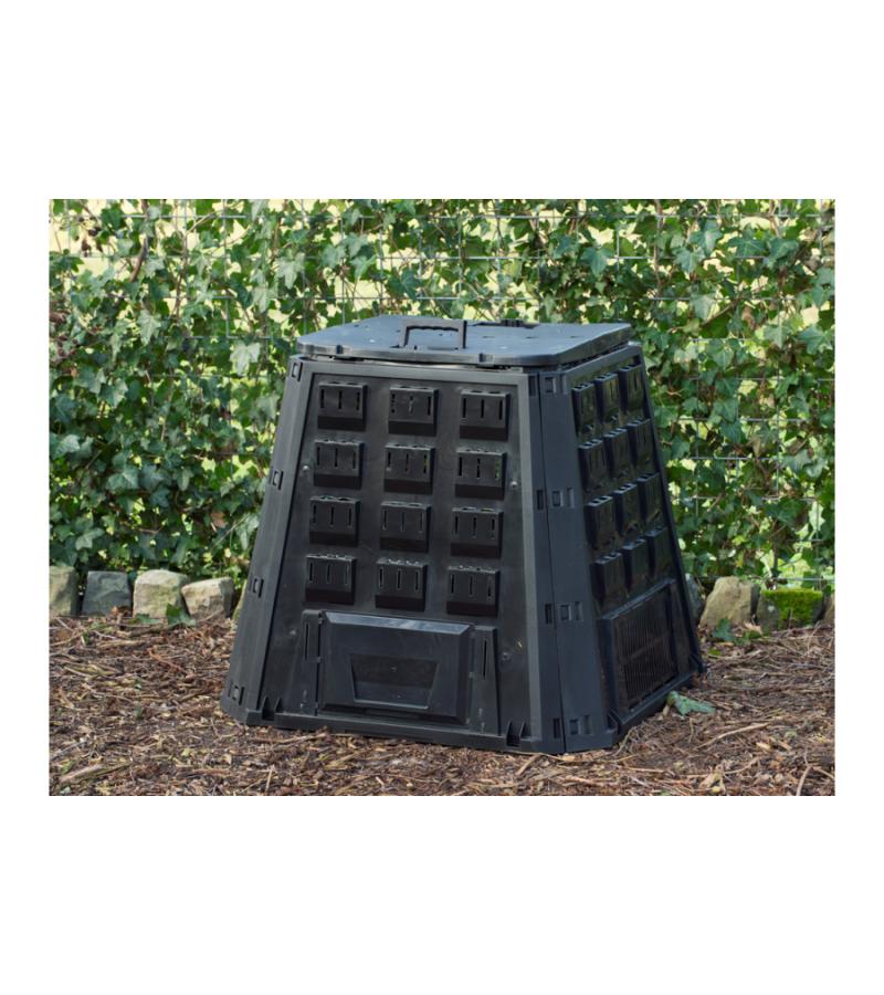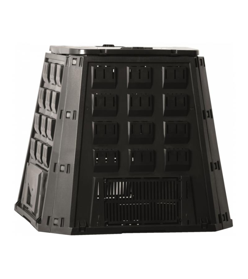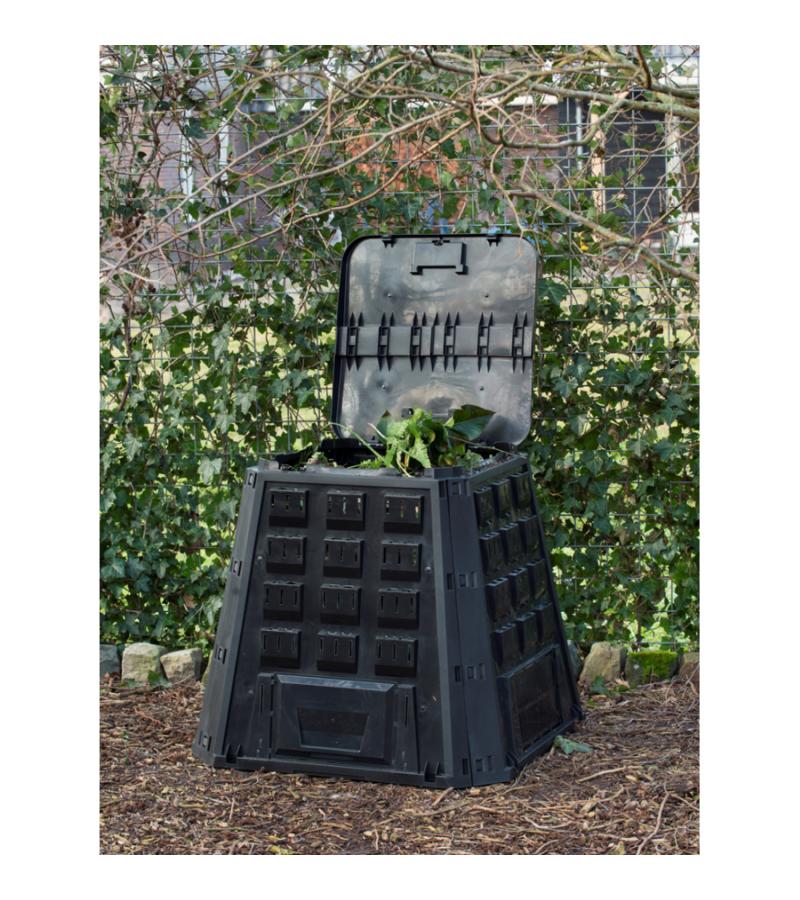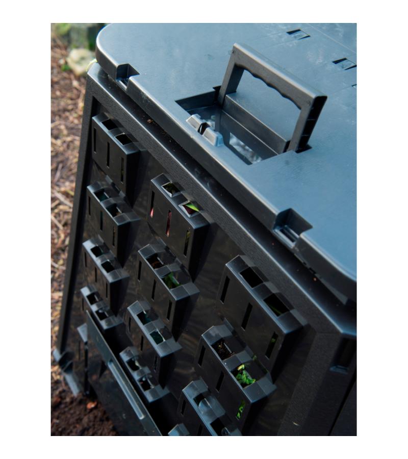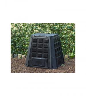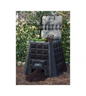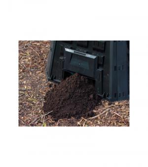 De compostbak is vervaardigd uit bestendig polypropyleen in een zwarte kleur. De compostbak is voorzien van een scharnierend deksel om het afval in te werpen en een opening aan de voorzijde om de compost te kunnen omwoelen of verwijderen. In de wanden van de silo zijn Thermolen verwerkt die voor een constante hoge temperatuur zorgen, waardoor het afval sneller wordt afgebroken. De compostbak beschikt over een inklapbaar systeem waardoor hij makkelijk in elkaar te zetten is en waarnodig eenvoudig opgebergd kan worden. Om micro-organismen aan te trekken kunt u het compostvat het beste op de grond in de schaduw neerzetten. Leg op de bodem enkele takken neer, dit zal zorgen voor een goede afwatering en verluchting.