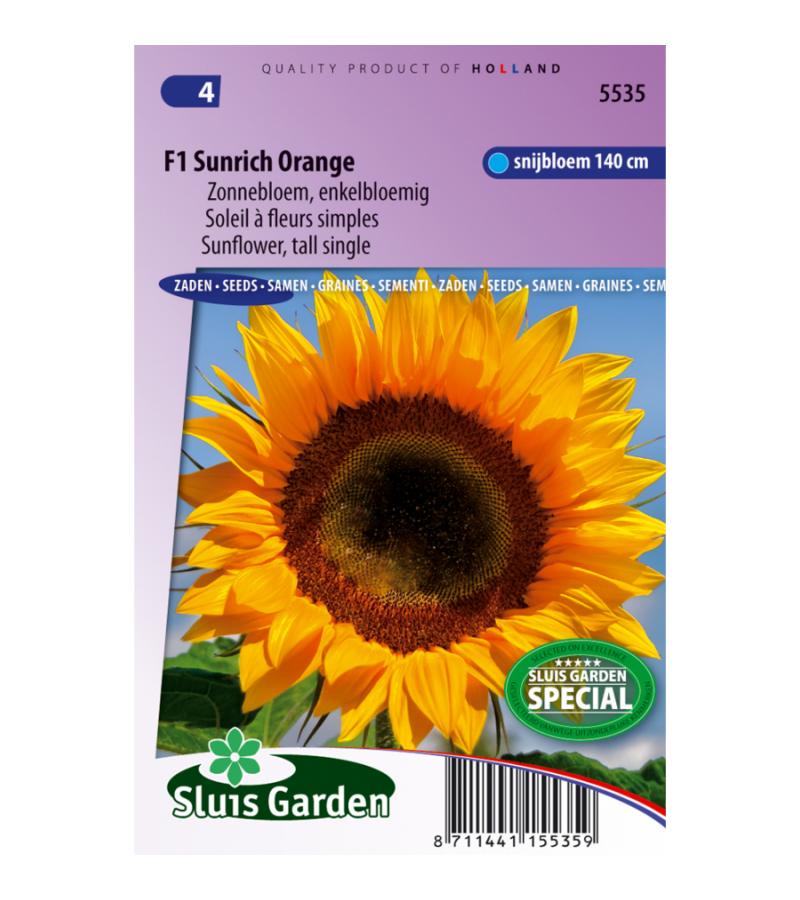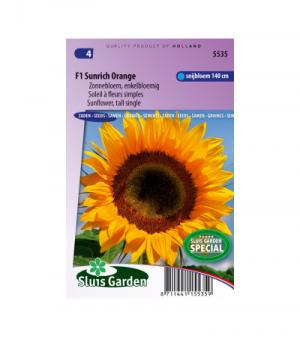 De zonnebloem Sunrich Orange is een geeloranje zonnebloem met een hoogte van 140 cm. U kunt de bloem eenvoudig gebruiken als achtergrondbeplanting of solitair, maar ook als snijbloem doet hij het goed. Zaai de zonnebloem in de volle grond of voor een sneller resultaat onder glas voorzaaien, verspenen en later uitplanten.