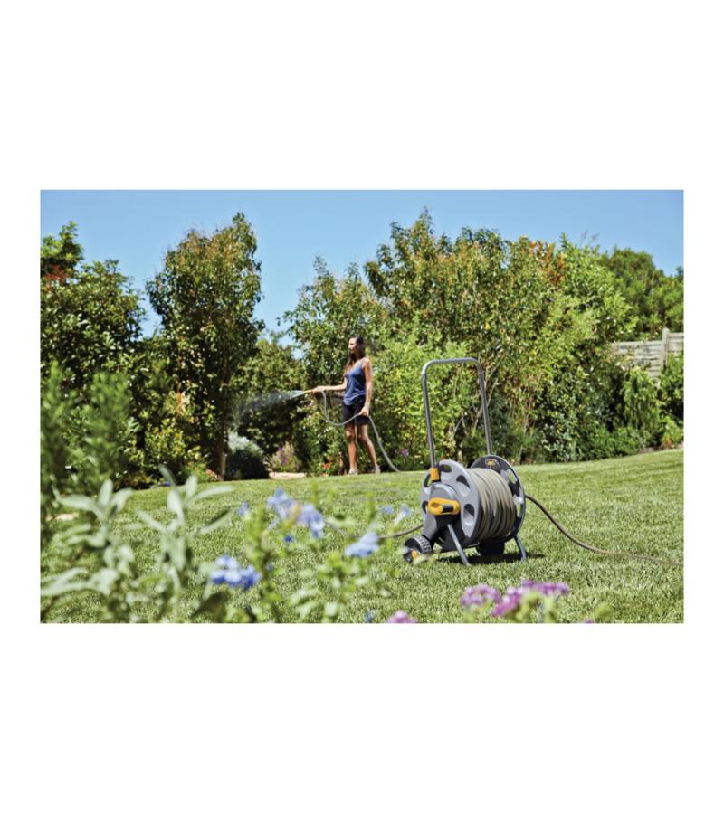 Deze verrijdbare haspel is ideaal wanneer u uw haspel regelmatig moet verplaatsen. De haspel is geschikt voor maximaal 60 meter tuinslang. De slangenwagen is inclusief 2 koppelstukken zodat u uw tuinslang kunt koppelen en de haspel snel in gebruik kunt nemen. Na gebruik bergt u uw tuinslang snel weer op door aan de hendel te draaien.
