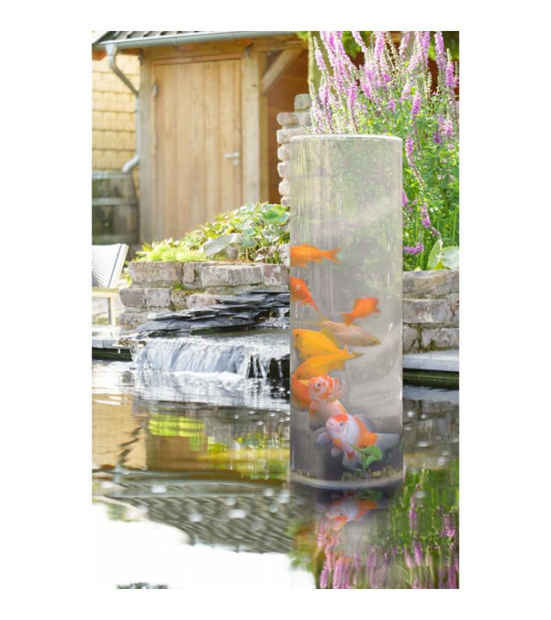 Bij het doorbreken van de eerste zonnestralen zal het water in de toren warmer worden dan het water in de rest van de vijver, door de warmte worden de vissen aangetrokken en zwemmen zij de toren in. Door het materiaal van de toren lijken de vissen optisch groter, optimaal genieten van de vissen dus!