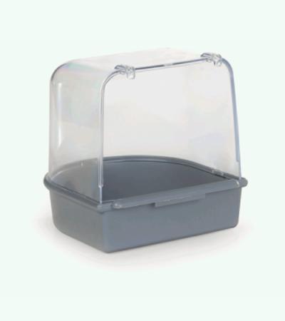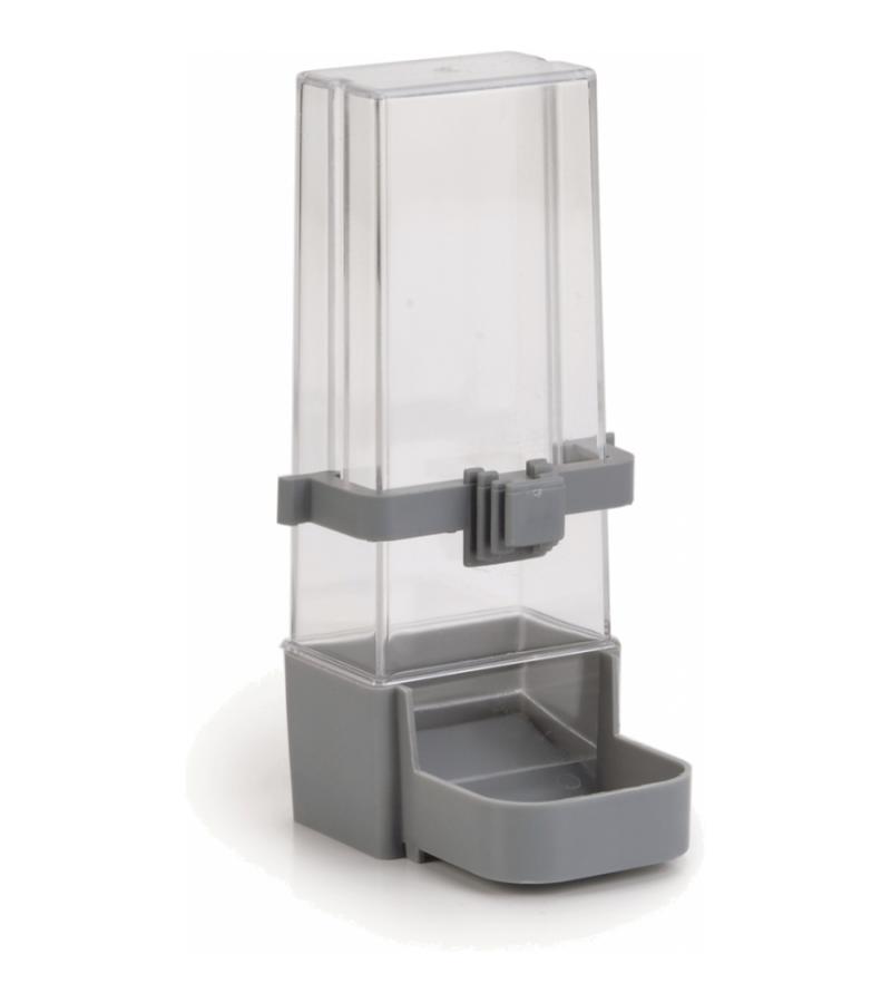Een plastic voeder en drinkfontein voor de parkiet. Voor diverse vogelkooien. Kleur: grijs, transparant.