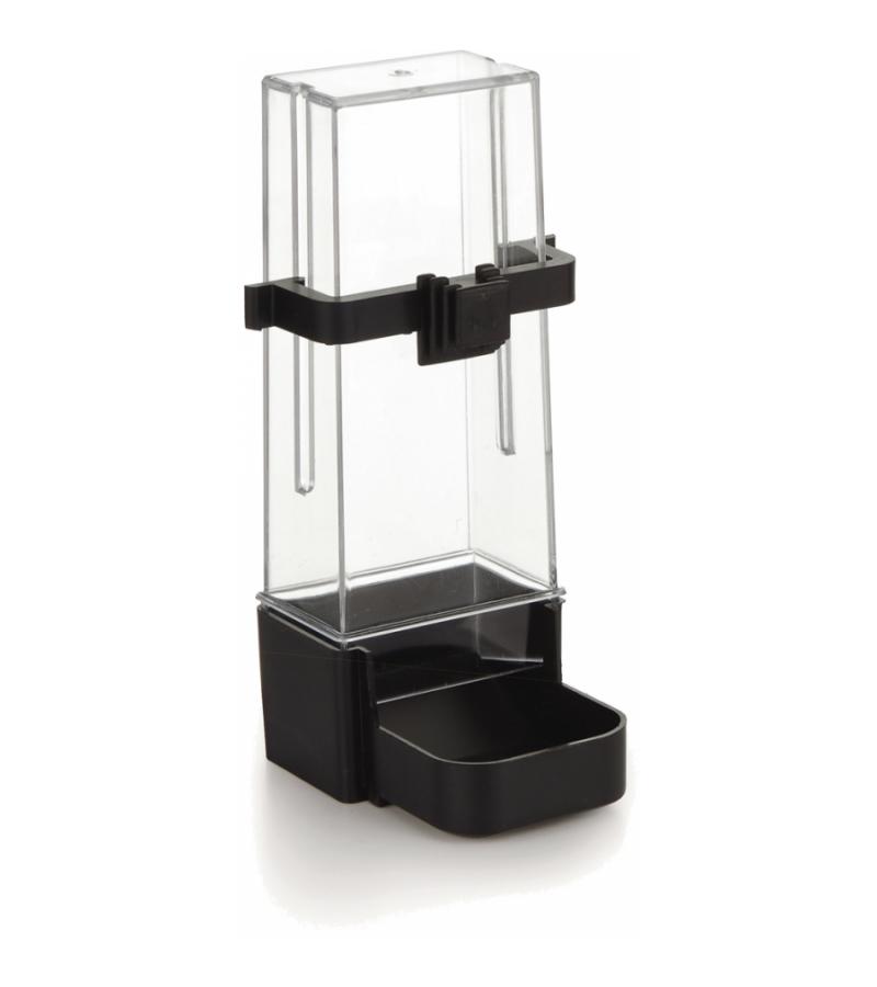 Een plastic voeder en drinkfontein voor de parkiet. Voor diverse vogelkooien. Kleur: zwart, transparant.