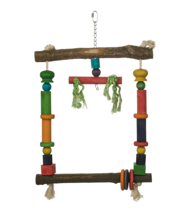 Een houten papegaaienschommel voorzien van diverse beweegbare houten kralen en schijven. ophang haak bijgeleverd. Een aanwinst voor uw papegaai.