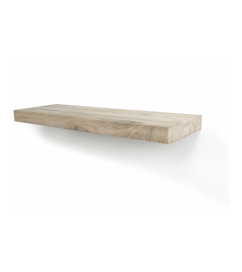 Zwevende gladschuurde massieve wandplank van eikenhout met recht gezaagde afwerking aan het vooraanzicht.