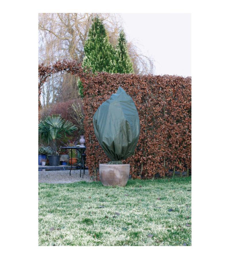 De winterafdekhoes is gemaakt van niet-geweven polypropyleen en heeft een dichtheid van 50 g/m². De afdekhoes is groen van kleur en bestand tegen uv-stralingen. Het niet-geweven polypropyleen materiaal zorgt voor een goede bescherming van uw plant en zorgt er tevens voor dat water, lucht en licht worden doorgelaten zodat de plant wel kan blijven ademen. De opening van de hoes is voorzien van een handig aantrekkoord waardoor de hoes snel om uw plant te bevestigen is. De beschermhoes is verkrijgbaar in drie verschillende afmetingen.