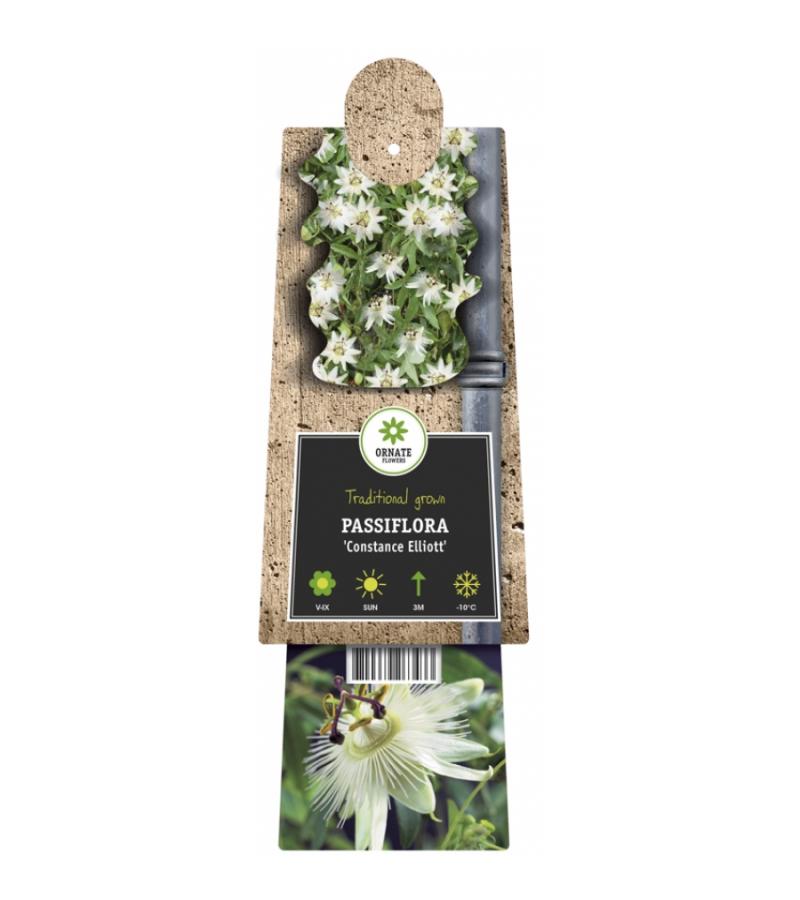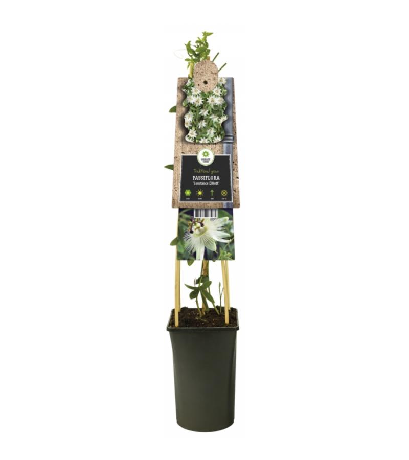 De zuiverwitte, stervormige bloemen van deze passiebloem zijn werkelijk fantastisch! De bloemen hebben een zeer exotisch voorkomen met het witte blad en de daarbij afstekende groen/paarse stamper. Na de bloei verschijnen er passievruchten, deze zijn eetbaar, maar de meningen verschillen over de smaak er van. Maar of u ze nu lekker vindt of niet; ze zijn sowieso een extra sierfactor voor deze exotische klimplant. De passiebloem is zeer geschikt als kuipplant; de planten zijn niet heel goed bestand tegen onze winters. Wilt u de plant overhouden, dan kunt u deze het beste binnen laten overwinteren. En eerlijk is eerlijk; zo'n prachtige plant heeft u toch ook het liefst dicht bij uw terras zodat u hier nog meer van kunt genieten?