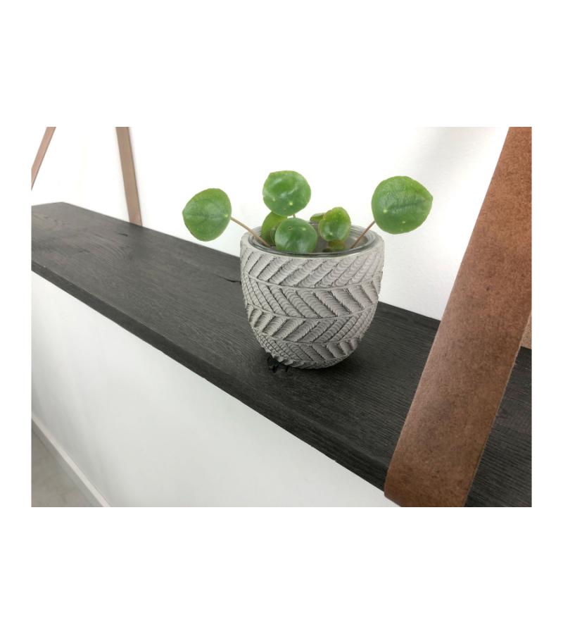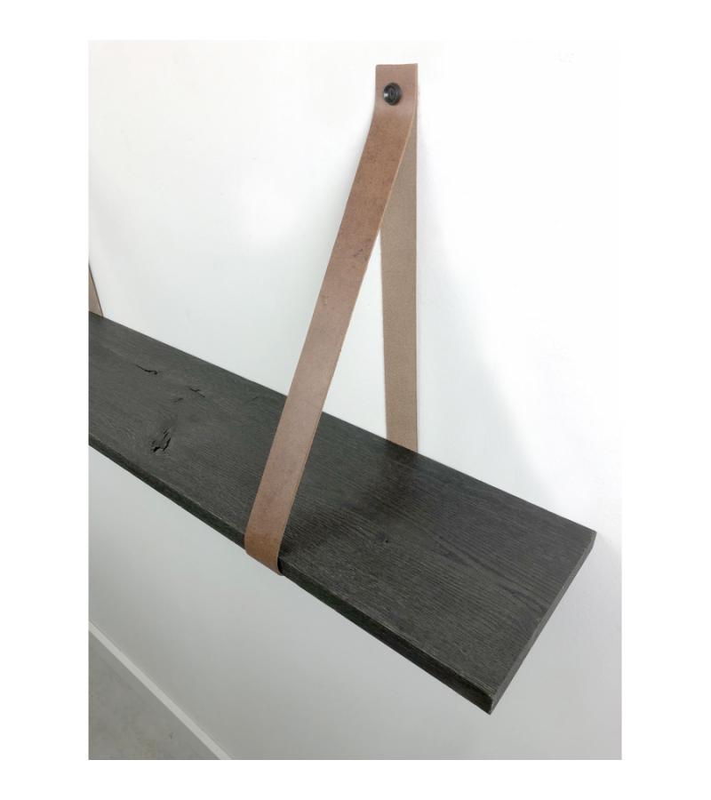 Eiken 18mm wandplank recht zwart 80 x 20 cm inclusief leren riemen cognac