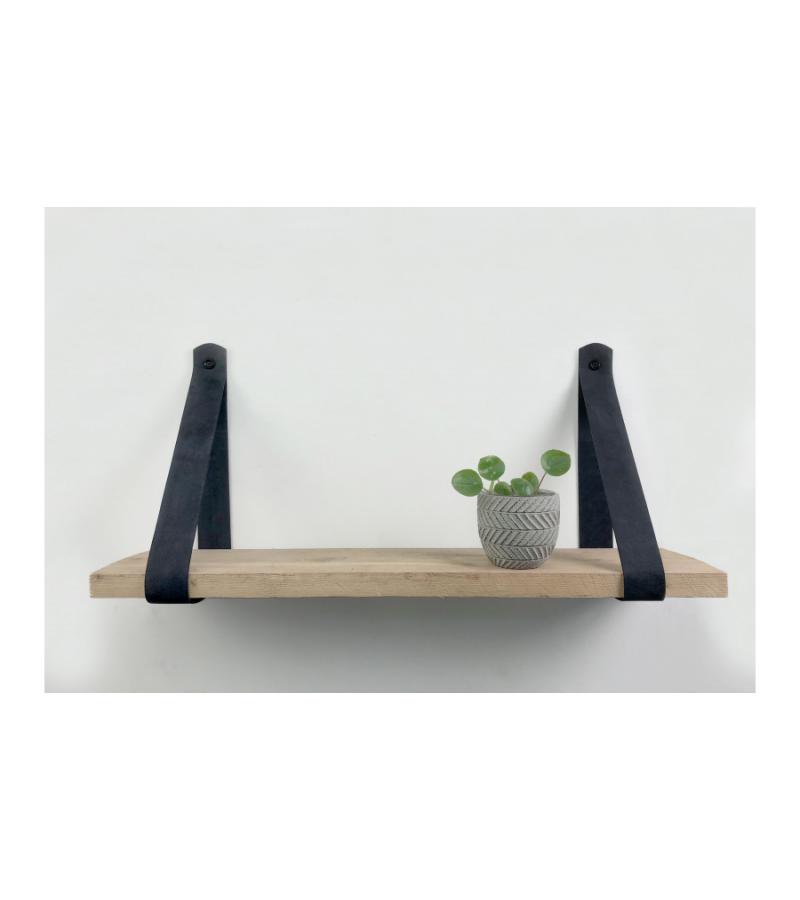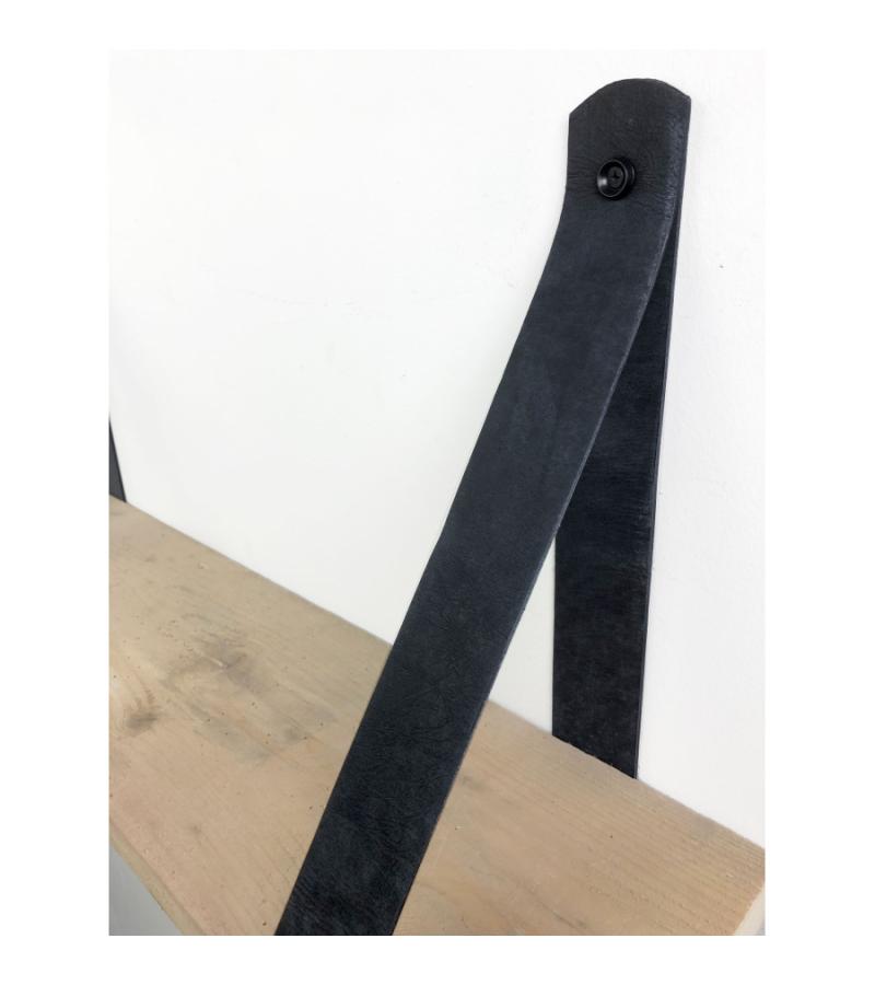 Steigerhout wandplank gebruikt 80 x 20 cm inclusief leren riemen zwart