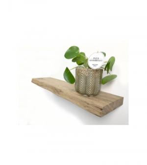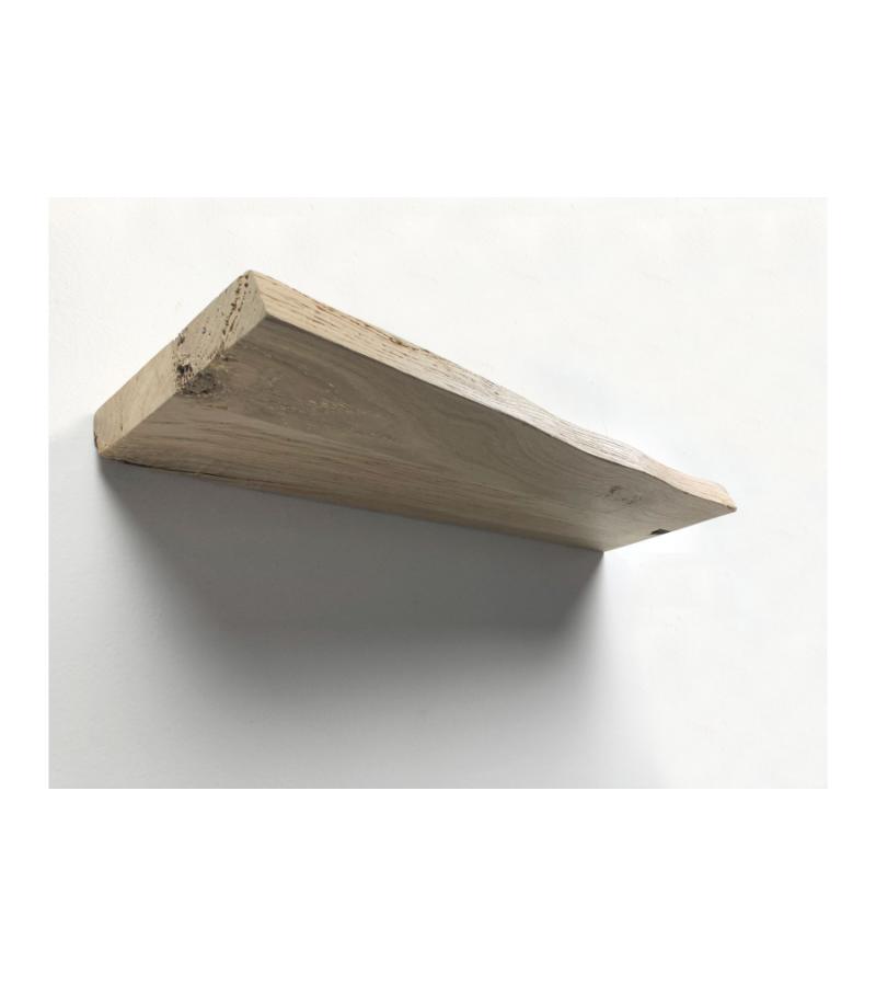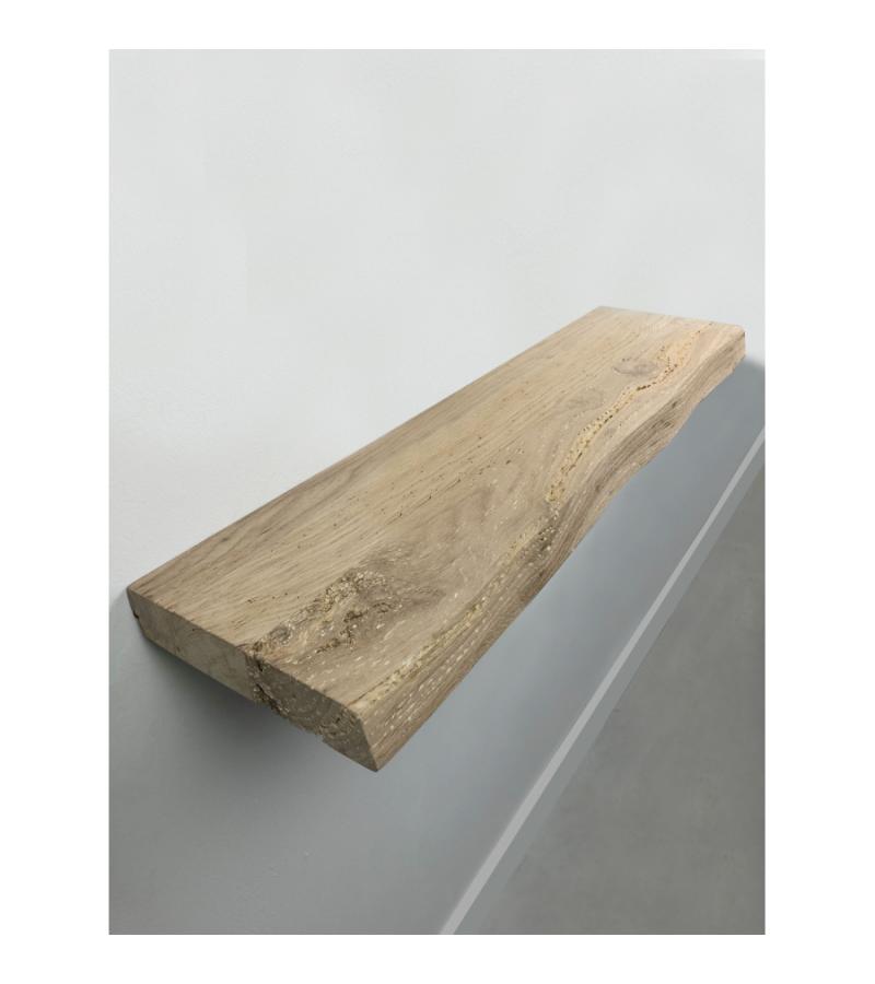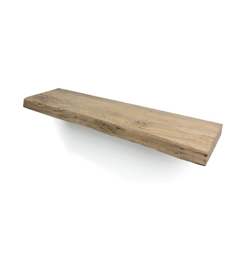 Deze zwevende wandplank van oud eikenhout kent een boomstamvorm afwerking. Aan de voorzijde van de plank zie je nog goed waar de schors heeft gezeten en de golvende vorm hiervan is nog zichtbaar. Dit detail geeft een levendige, landelijke uitstraling. Oud eikenhout vertoont meer groeven dan massief eiken, het is een geleefde plank. Dit hout krijgt een nieuw leven door het te gebruiken voor de zwevende wandplank van oud eiken.